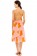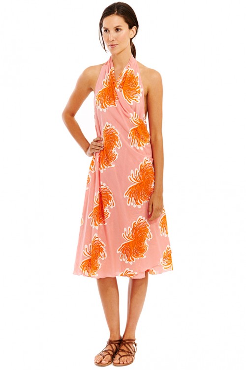 We travel to the Far East, to a beautiful Japanese garden housing exotic blossoms and flowers. This traditional Japanese floral print has been injected with Roberta Freymann's signature bold color palette for a fresh, modern look. The Jardin print has been created through a traditional block printing process, which removes color and is then printed over to capture a richer, more striking hue. The Mora halter dress wraps in the front like a smock with self, detachable belt. About 46" at longest point - when wrapped, length hits right below the knee.
