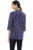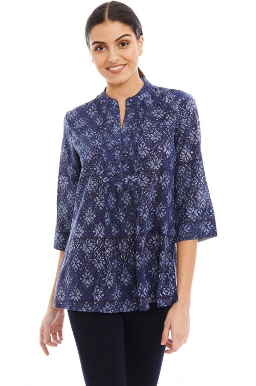 The Arles shirt features center front pleating, a deep V-neck with one fabric button, a mandarin collar, three-quarter length sleeves, and a flowing and flattering cut.