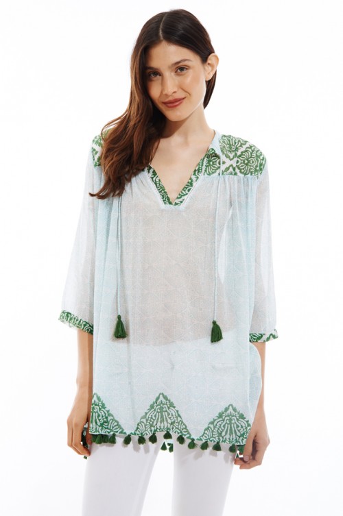 With this overprinting pattern we sought to recreate the organic flow of contrasting tile work characteristic of Southwestern homes. The Serafina top features a rounded keyhole collar with tasseled necktie. A contrasting printed yoke, sleeve and printed border hem with pom poms complete this standout piece.