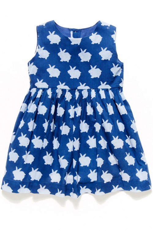 Who doesn't love a cute bunny rabbit print? Our Coelho print features a white rabbit printed on colored background. Each garment is printed by hand by local artisans, who create one of a kind garments through a traditional block printing process. The Chantal dress is adorable for any occasion! This sleeveless style features a pleated, empire waist for a classic and sweet look.