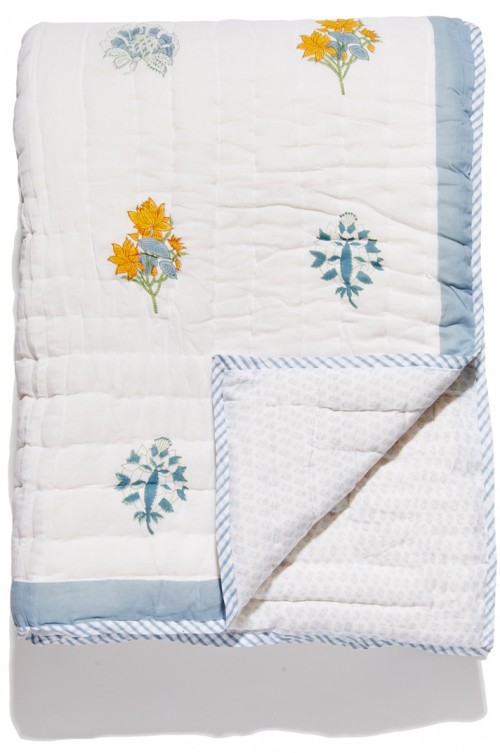 The Larissa print features different variations of blooms on a white canvas. Each garment is printed by hand by local artisans, who create one of a kind garments through a traditional block printing process. This cotton quilt is lightweight, incredibly soft to the touch, and colorful. Perfect for the bedroom or as a throw over in your family room or den during those cold winter nights when cozying up to the fireplace.