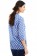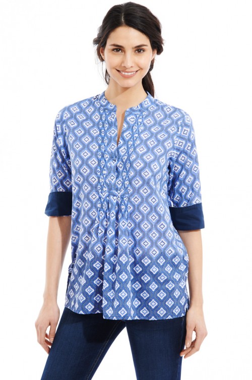 The Arles shirt features center front pleating, a deep V-neck with one fabric button, a mandarin collar, three-quarter length sleeves, and a flowing and flattering cut.