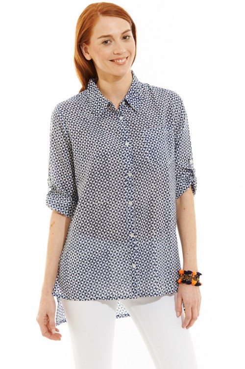 The Tail shirt features button down front with stand up collar, roll tab sleeves, straight hem and high-low styling.