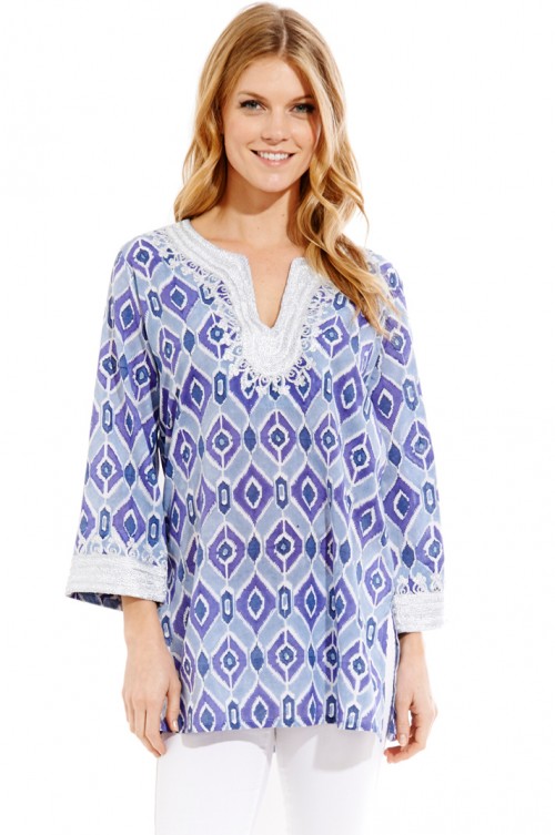 The Yoruba print was derived from a town in Africa known for its indigo dyeing process. In true Roberta Freymann style, this honeycomb print is saturated in bold, vibrant color. We turned our classic kurta up a notch with the Casa kurta, which features traditional Aari embroidery, with woven metallic thread in a Moroccan pattern around neckline and sleeve cuffs.
