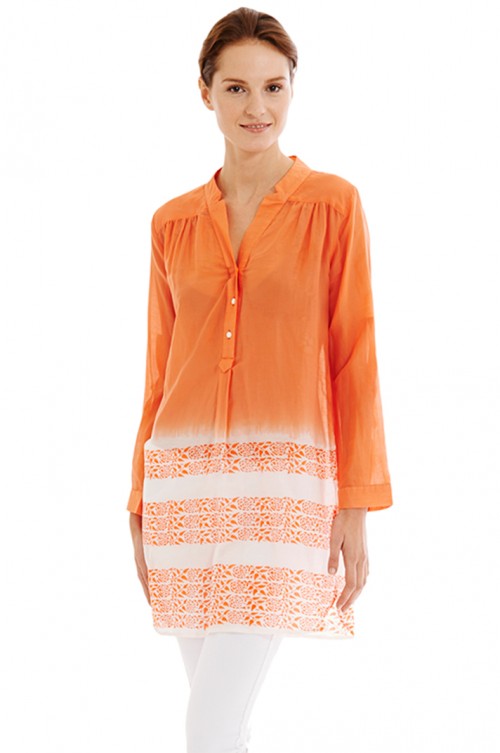 We have mixed European influenced prints with Roberta Freymann's signature touch of exoticism and mystique to create a soft, delicate and feminine floral print that will complement any outfit. The Kolam print has been dip-dyed upside down for something a little more unexpected! The Romy Kurta is an easy pull-on style with 3-button down notched shirt collar, long sleeves with roll-tab, and shirttail hem. Wear as a unique swim cover-up or long tunic over skinny jeans, shorts or a cropped pant.