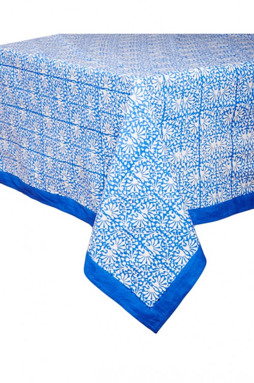 Pondi is a town in South India - a French colony settled by the Portuguese. We take note of this blend of East meets West with hypnotic curved patterns augmented by the signature Roberta Freymann touch. Finished off with contrasting binding, this tablecloth is the perfect decorative feature for any dinner table and transforms an everyday dinner into a special occasion.